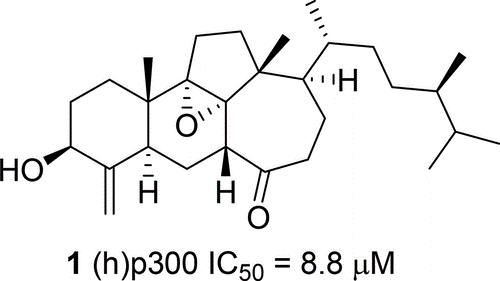 Swinhoeisterols C–F (1–4), four new steroids having a rearranged 6/6/5/7 ring system, were isolated from the Xisha sponge Theonella swinhoei, together with the known analogue swinhoeisterol A (5). Their structures were determined based on spectroscopic analysis, TDDFT-ECD and optical rotation calculations, and biogenetic correlations. In an in vitro assay, compound 1 showed an inhibitory effect on (h)p300 with an IC50 value of 8.8 μM, whereas compounds 2–4were not active.