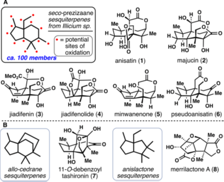 自上世纪60年代后期对八角茴香醚的结构进行确定以来,在之后的50年中分离发现了100多种类似天然产物,其紧凑的骨架结构,极高的氧化水平和特有的神经活性吸引了来自全世界的合成化学家致力于该类天然产物的合成研究工作。本文重点介绍了近年来该类天然产物的全合成策略,旨在给与更多的合成工作者以启发和参考意义。