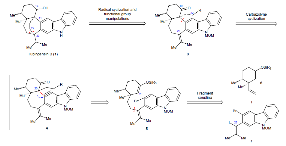 Tubingensin B的结构看似简单,但两个相邻的C(sp2)-C(sp3)键以及与咔唑相连的两个季碳手性中心都是合成的难点,更为挑战的是与咔唑稠合的双环-[3.2.2]-壬烷和高度官能化的六元环部分。该天然产物共含有5个手性中心,其中3个是季碳中心,而且有2个季碳中心还相邻。作者通过芳炔环化策略作为关键步对Tubingensin B进行了高效的全合成。这种利用芳炔环化策略构建多种复杂结构(例如构建相邻的季碳手性中心)的思路,值得深入学习研究。