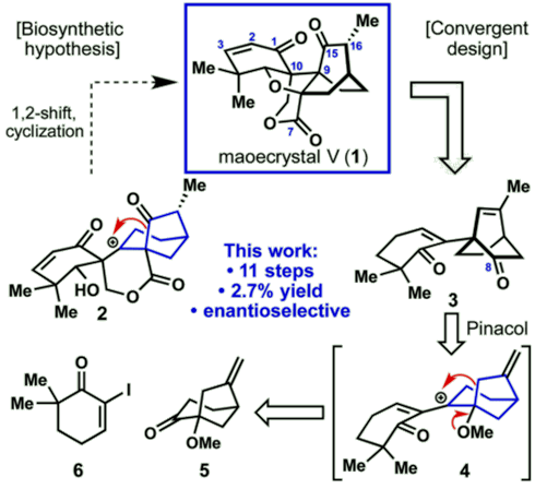 天然产物Maoecrystal V 具有独特的五环骨架,含有6个手性中心,其中包括4个连续手性中心,2个为连续手性的季碳。MV分子中具有并环、螺环、桥环、内酯环、四氢呋喃环等结构,对HeLa细胞系具有较强的选择性和细胞毒性(IC50 = 60 nM)。迄今为止,共有五个课题组完成了其全合成。Baran课题组基于生源合成假说,不使用D-A反应,而是采用Pinacol重排为关键步骤,以11步反应、2.7%的总收率完成了MV的不对称全合成,这对MV及其类似物的多样性合成和生物活性研究都具有重要意义。