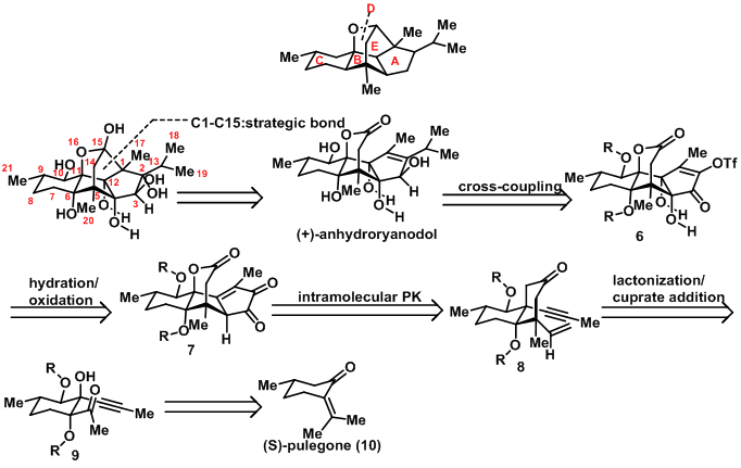 Ryandine及其水解产物Ryanodol对细胞内控制钙离子释放的受体RyRs有很高的亲和性,且与许多神经退化疾病,如阿尔兹海默症息息相关。分子中有多个碳原子处于饱和状态且大多都与氧相连,氧化态很高。作者以极其敏锐的眼光选取断键位置,以PK 反应构建关键碳环并且用Riley氧化引入三个羟基,用15步合成了Ryanodol,相较之前较大的缩短了合成步骤,提高了合成总收率。
